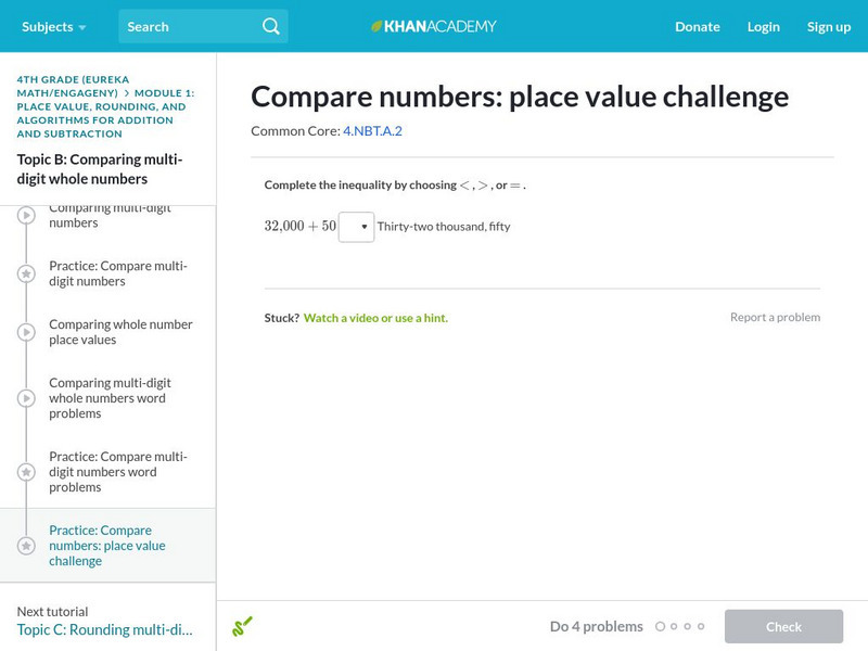 Khan Academy: Comparing Multi Digit Numbers: Place Value Challenge