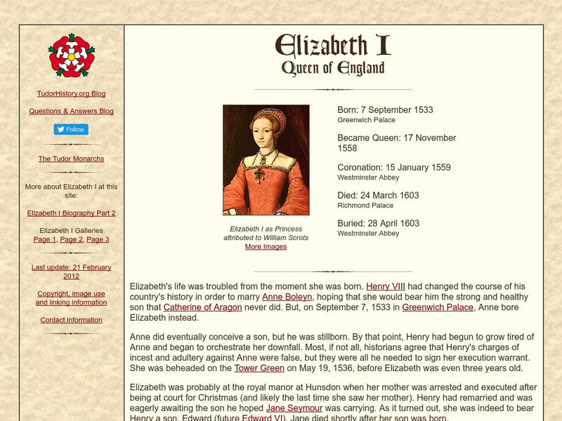This biographical resource for Queen Elizabeth I can help students collecting background information or for use in classroom discussion and assignments.