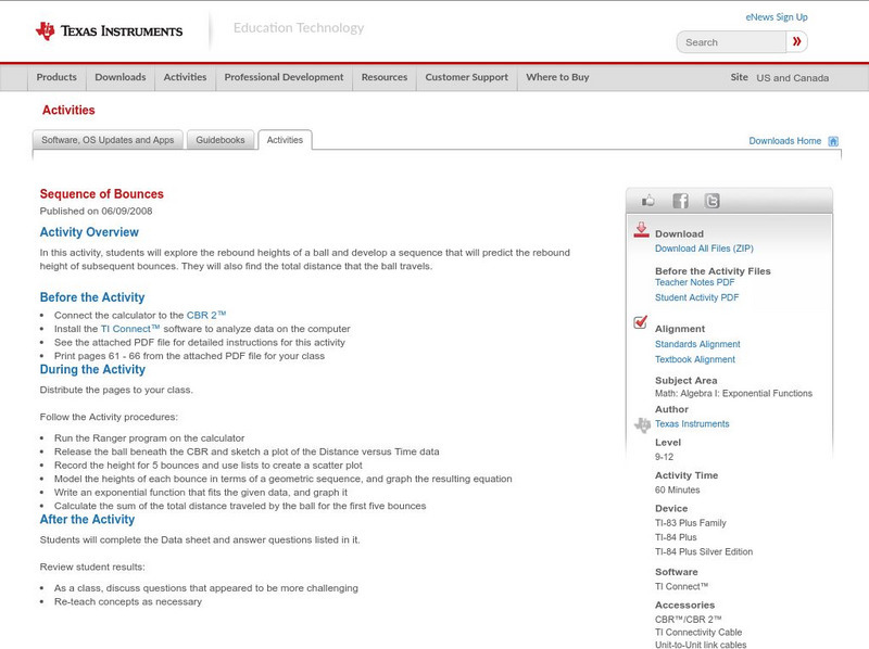 In this activity, students will explore the rebound heights of a ball and develop a sequence that will predict the rebound height of subsequent bounces. They will also find the total distance that the ball travels.