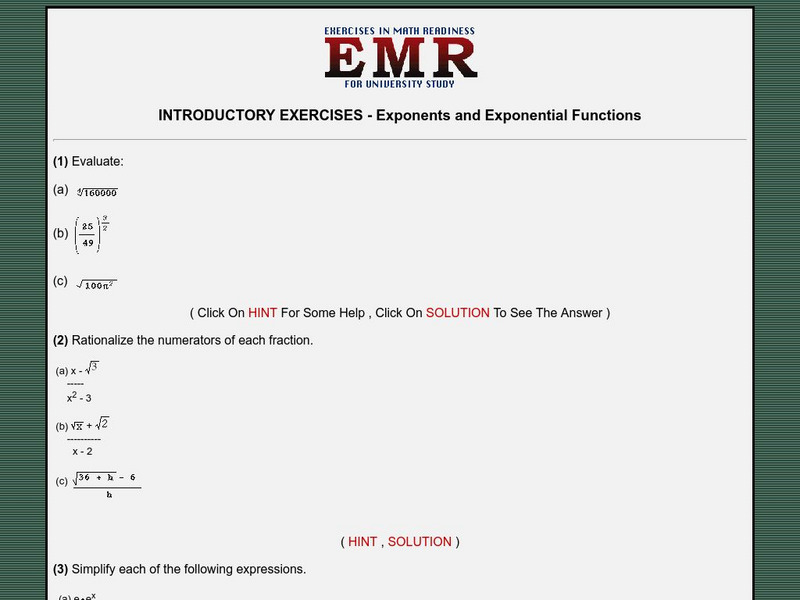 Site provides two sets of problems about exponents and exponential functions which are moderately difficult. Site provides hints for the problems and solutions with explanations for students.