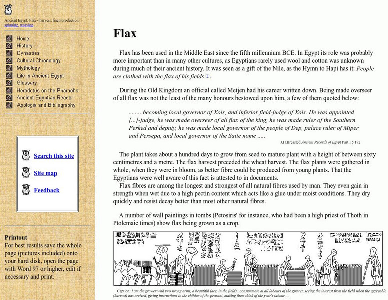 Provides detailed information regarding the growing of flax for weaving into linen cloth by Ancient Egyptians. Includes images illustration Ancient Egyptian flax production.