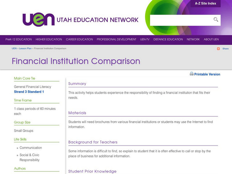 The lesson plan investigates financial literacy. Teachers can use the lesson plan to help students learn how to choose a financial institution. Objectives, instructional procedures, and additional resources are included.