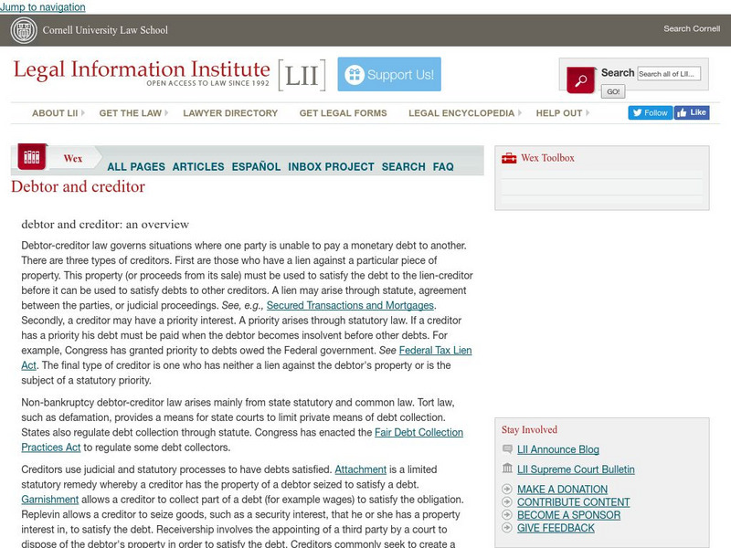 Cornell University: Law School: Debtor and Creditor: An Overview