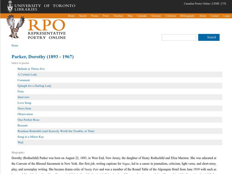 An extremely rich site, this offering from Modern American Poetry covers all aspects of Dorothy Parker's (1893-1967 CE) work. Included are critical commentaries, biographical information, a Parker Gallery and other resources.