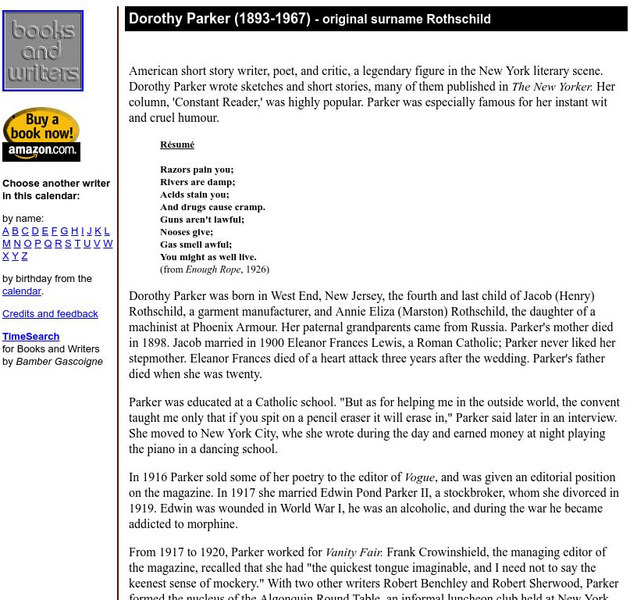This site offers an organized collection of biographical information on Dorothy Parker.