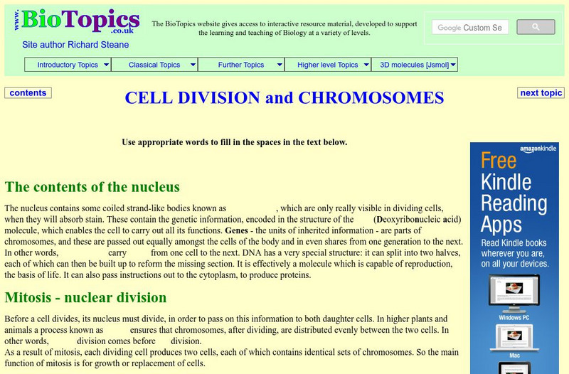 An information sheet where students fill in the appropriate words to complete the page on cell division. Also included on page is diagrams of binary fission and cell division.