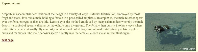 A three-page introduction to reproduction in amphibians can be found at this site. Read about the various methods of reproduction, and what happens after the eggs are laid. There is also a section that shows the growth/development stages...