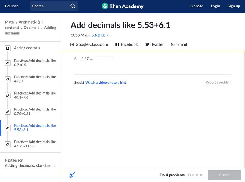 Add whole numbers, tenths, and hundredths like 60+2.57 or 5.53+3.1 Students receive immediate feedback and have the opportunity to try questions repeatedly, watch a video or receive hints.