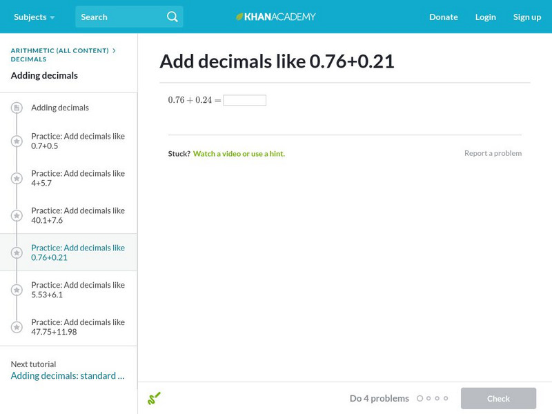 Add hundredths like 0.76+0.21 Students receive immediate feedback and have the opportunity to try questions repeatedly, watch a video or receive hints.