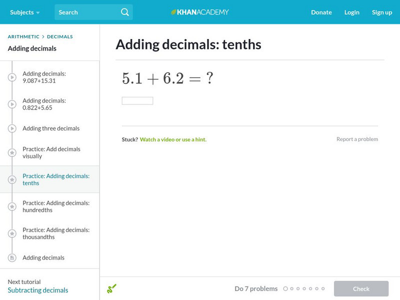 Add two numbers that are either whole numbers or written to the tenths place value. Students receive immediate feedback and have the opportunity to try questions repeatedly, watch a video or receive hints.