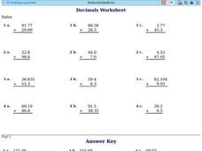 In this decimal addition activity, students use addition to solve the decimal equations that range to the thousandths place. Students solve 15 problems.