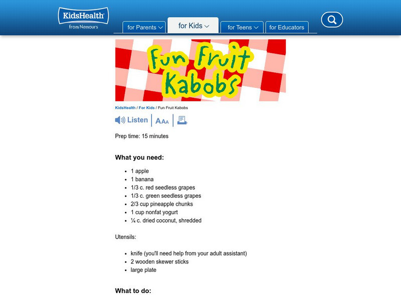 Have fun and eat fruit every day to stay healthy. This website provides simple steps you can follow to make your own "fun fruit kabobs" with apples, bananas, grapes, pineapple, coconut, and yogurt. Includes nutritional information.