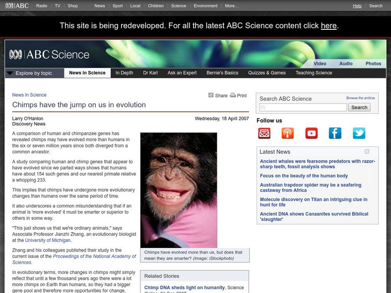Australian Broadcasting Corporation: News in Science: Chimps Have the Jump on Us in Evolution