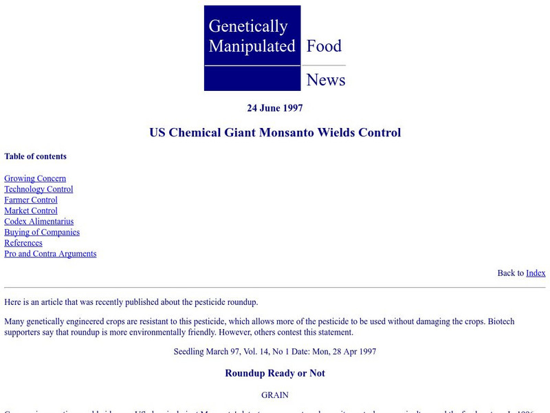 This article has lots of information on the practices of Monsanto, the chemical giant that produces Roundup and Roundup Ready Grains.