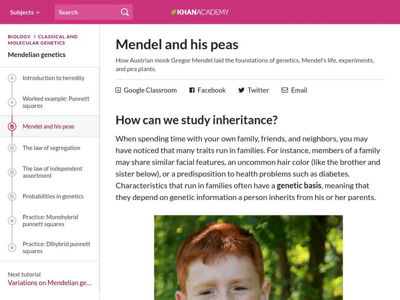 Instructional module focusing on Gregor Mendel's Laws of Inheritance. Discussion includes Mendel's discovery of dominant and recessive traits as well as co-dominance and incomplete dominance in genetics. Site also includes an interactive...