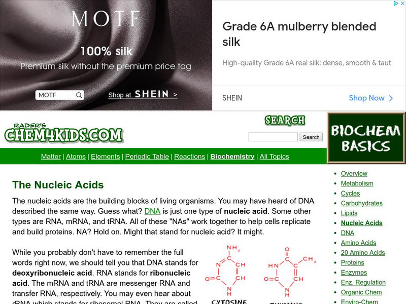 Chem4Kids! looks at nucleic acids and its "five easy parts": uracil, cytosine, thymine, adenine, and guanine.