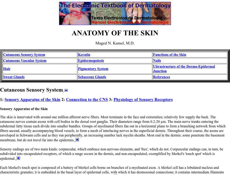 Despite the title of the page, this site explores the entire integumentary system, including skin, hair and nails. Content also includes the cutaneous sensory and cutaneous vascular systems, pigmentary system, sweat glands, sebaceous...