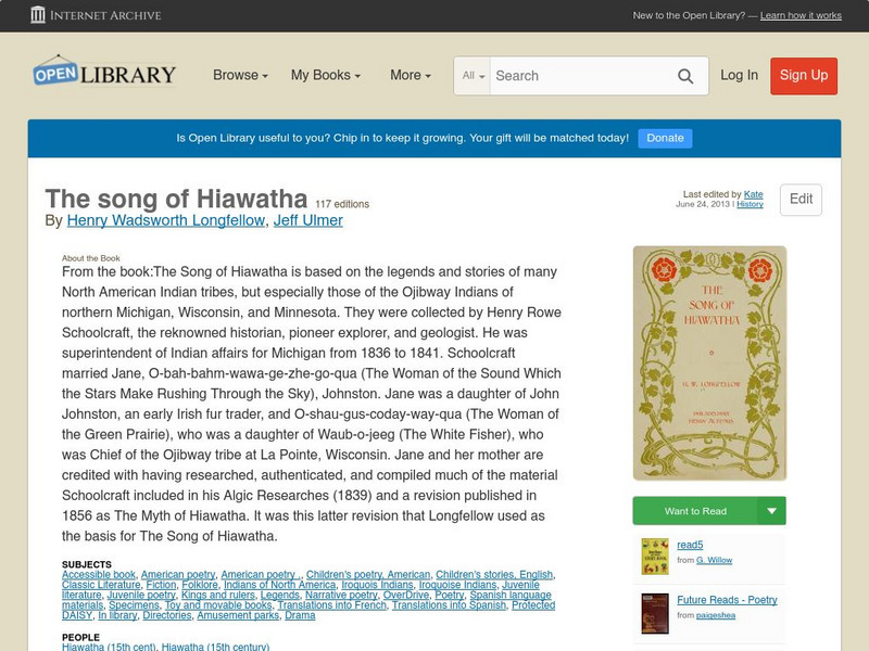 This ebook version of Jeff Ulmer Henry Wadsworth Longfellow's The Song Of Hiawatha has been made available in multiple formats by the Open Library. Editions of the full novel, organized by year of publication, may be accessed here.