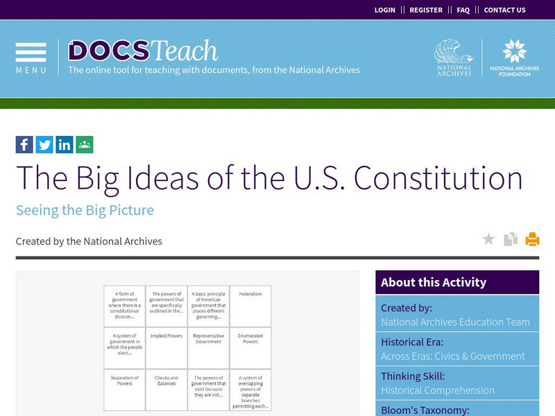 In this activity students will identify and define seven key ideas contained in the U.S. Constitution by making matches from the grid. They will then analyze documents that demonstrate each big idea in action.