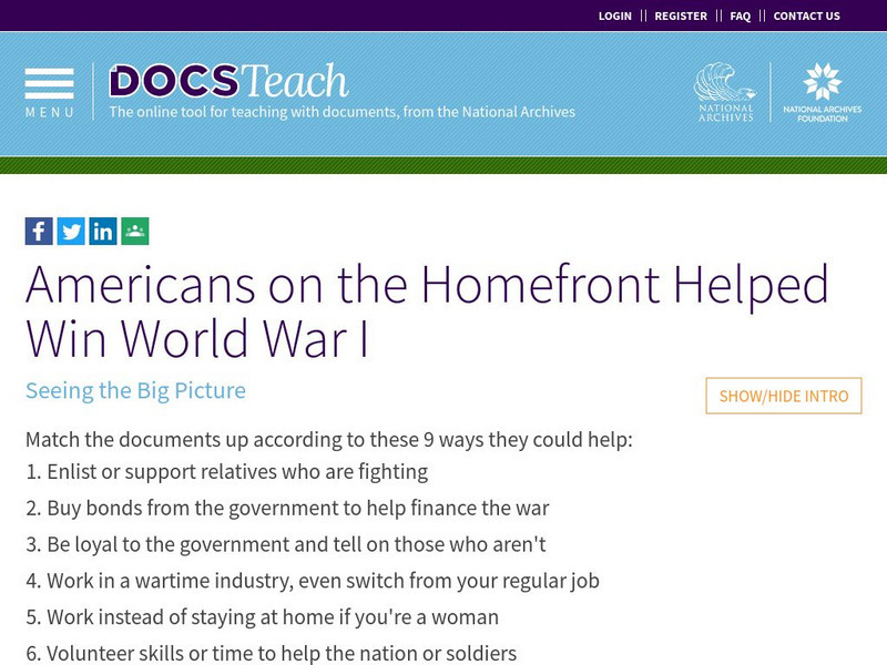 In this activity, students will match documents to visualize ways that Americans contributed to the war effort on the homefront during World War I. Students will see a payoff image related to the armistice celebration and reflect on the...