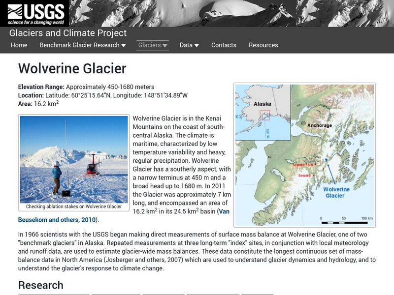 Learn about the history, mass balance and meteorlogical data, and view several photos of the Wolverine Glacier.