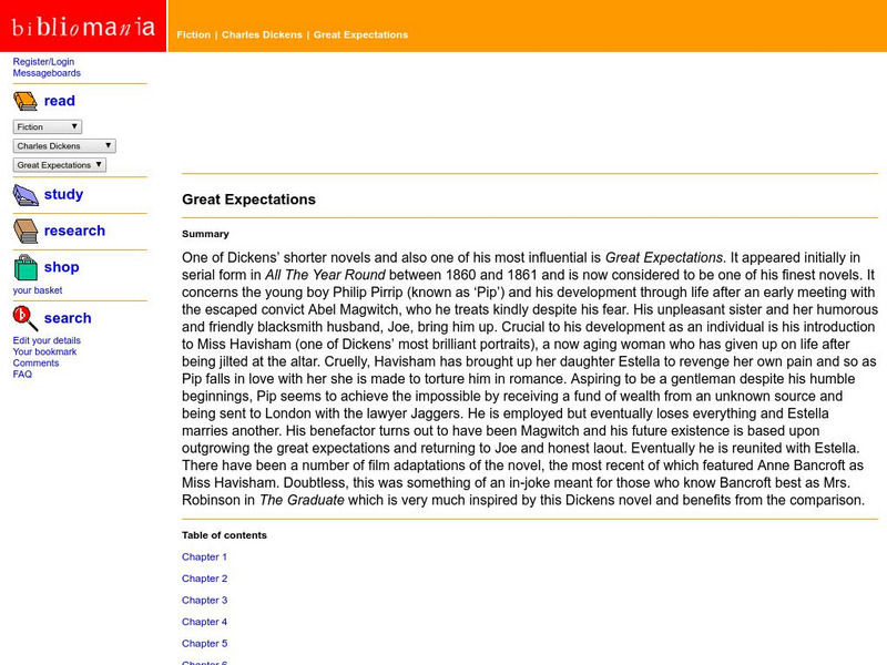 This site presents the full text of the Dickens' novel "Great Expectations". A brief summary supplements the content.
