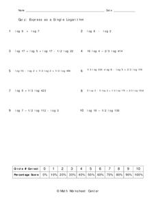 In this logarithms worksheet, 11th graders solve 10 different problems that include determining the single logarithm of each expression. First, they convert each logarithm to exponential form. Then, students solve each equation noting...