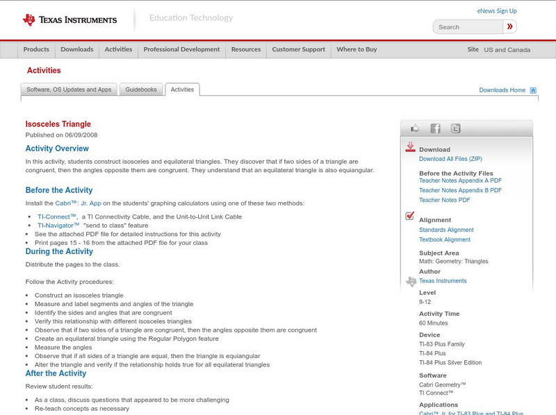 In this activity, students construct isosceles and equilateral triangles. They discover that if two sides of a triangle are congruent, then the angles opposite them are congruent. They understand that an equilateral triangle is also...