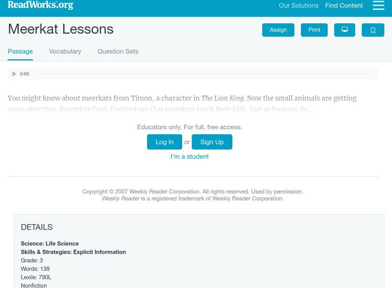 [Free Registration/Login Required] Students read about an African mammal called a meerkat. A question sheet is available to help students build reading comprehension skills.