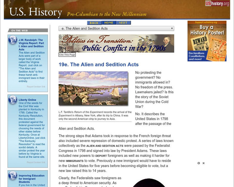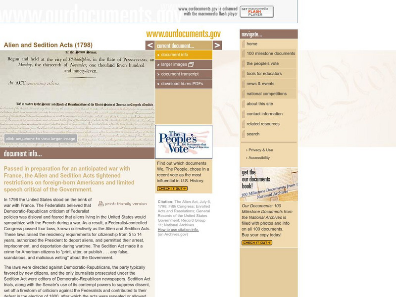The Alien and Sedition Acts were passed by Congress in 1798 because of feared war with France. This engaging page gives you the opportunity to see a complete copy of the original document and also gives links to a typed transcript,...