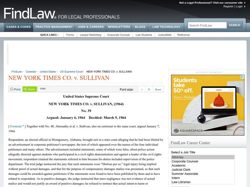 Find Law: u.s. Supreme Court: New York Times v. Sullivan (1964)