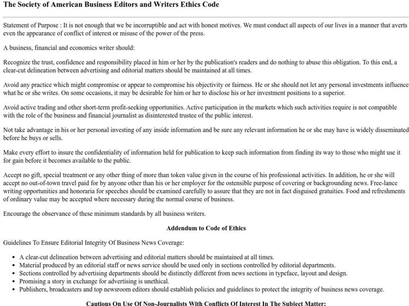 The official ethics code of The Society of American Business Editors and Writers provided for by the University of Hawaii.