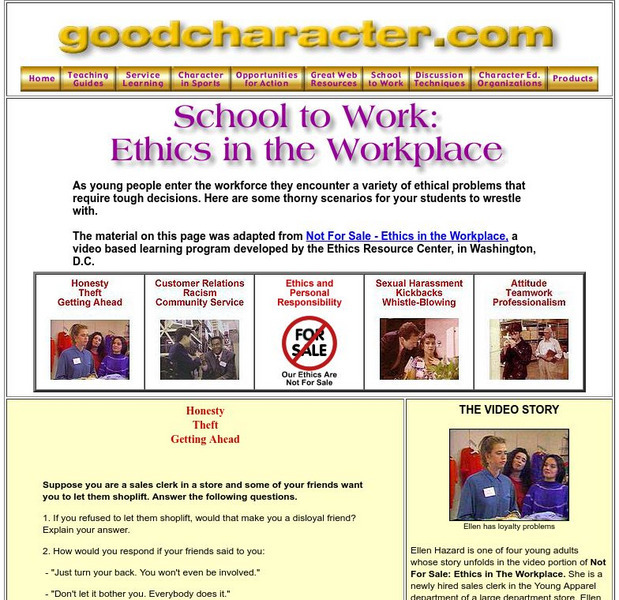 The pages in this website were created to accompany two video series, "In Search of Character" and "Not for Sale - Ethics in the Workplace, but most of the material can easily be used without the videos. Character topics include traits...