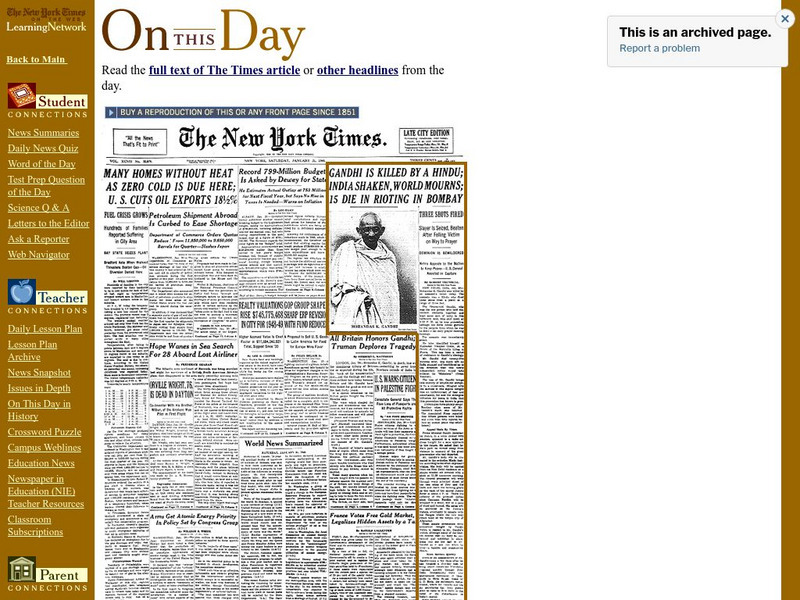 Access the front page article in the "New York Times" from January 30, 1948, announcing the assassination of Mohandas Gandhi.