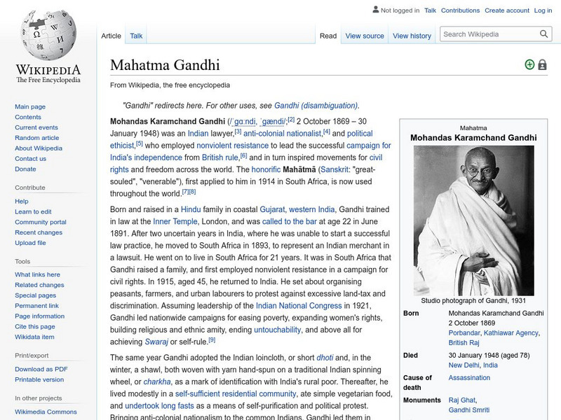 Lengthy biography of Mohandas Gandhi. One section of the article has been under dispute for the way it described criticisms of some of Gandhi's purported views. The resource section of the article has a large number of links on Gandhi.