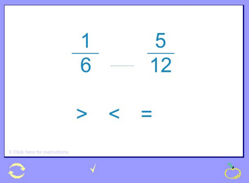 Students can practice comparing fractions using these interactive flashcards. The problem changes color when the correct symbol is chosen.