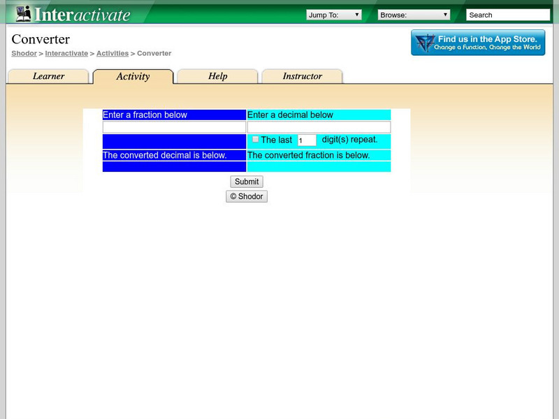 This is a handy little applet that lets you convert a fraction to a decimal or decimal to fraction. It can handle proper and improper fractions.