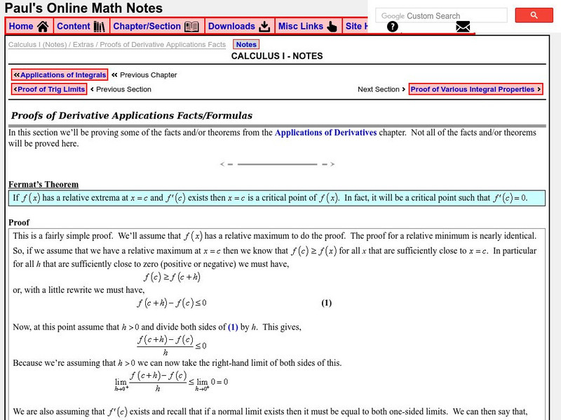 Paul's Online Notes: Calculus I: Proofs of Derivative Applications Facts