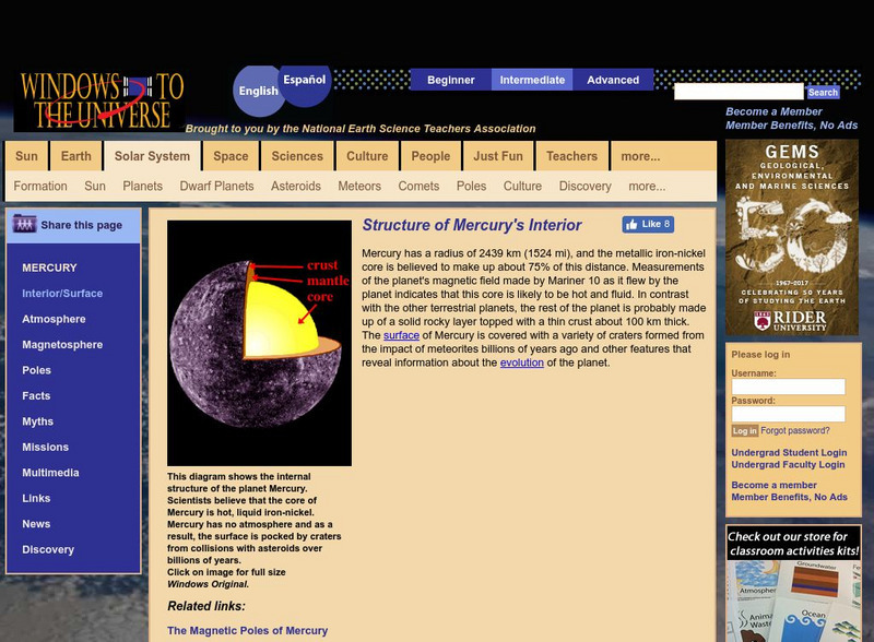 Windows to the Universe briefly details the structure of the interior of the planet Mercury.