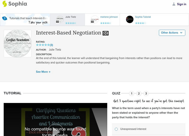 At the end of this tutorial, the learner will understand that bargaining from interests rather than positions can lead to more satisfactory and quicker outcomes than positional bargaining. It is 1 of 3 in the series titled...