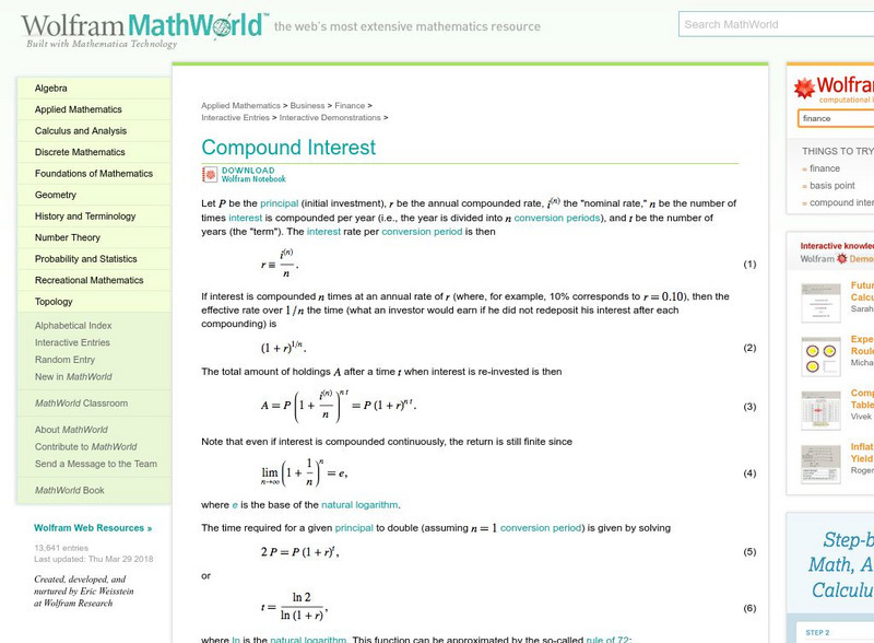 This MathWorld site gives formulas involved in computing compound interest variables are fairly well defined at this site. If you scroll to the bottom of the page you will find a formula to find the time involved for the principle to...