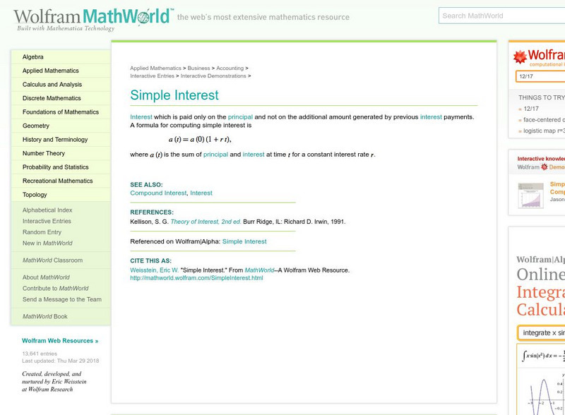This math site explains and defines the concept of "simple interest" and gives a formula for finding this value in terms of time and rate.