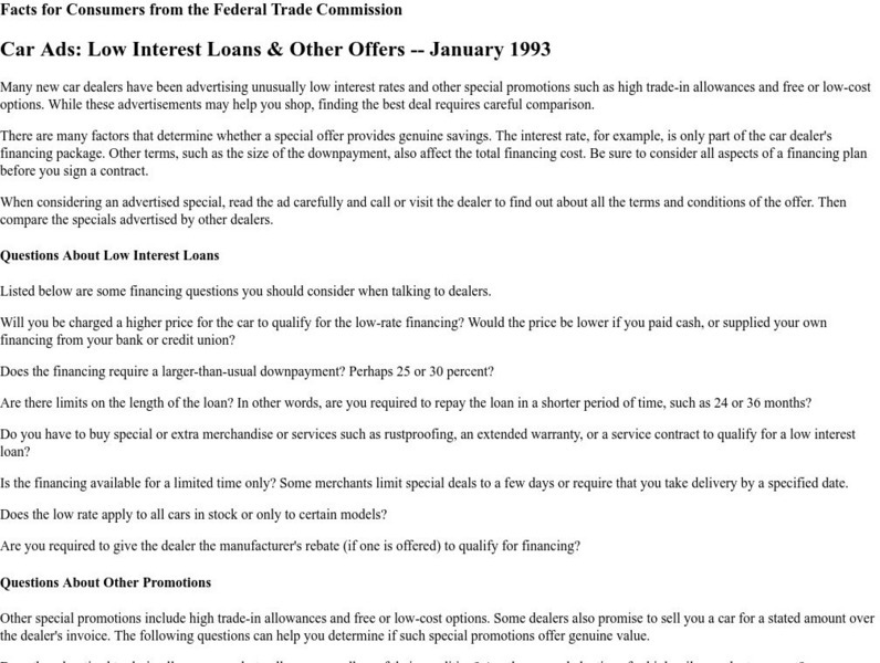 This page, provided by a law firm, gives Federal Trade Commission warnings on advertised low-interest rates and questions to consider before signing for a low-interest rate.