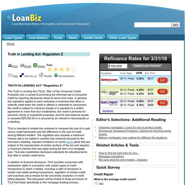 Site explains Regulation Z , "Truth in Lending" which is the "law requiring disclosure of terms" on a loan given to a business or consumer. Provides specific format of loan information to be disclosed.