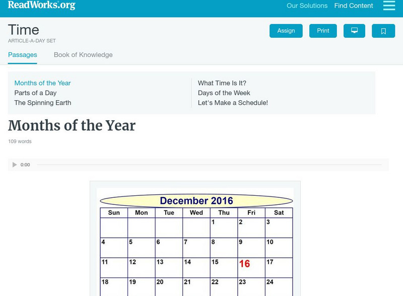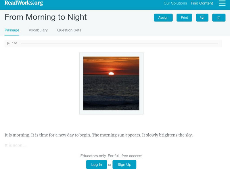 [Free Registration/Login Required] ReadWorks provides numerous resources filled with informational articles. "Parts of a Day" provides information about the parts of a day: morning, afternoon, evening, and night. This passage is designed...