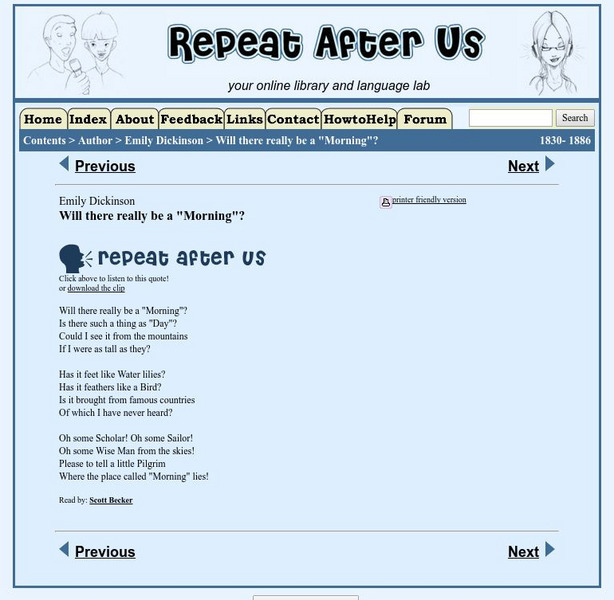 A poem from Emily Dickinson, "Will There Really Be a 'Morning'?", is provided on this site. Students may listen to this poem read aloud by Scott Becker and can access a printable version of this piece.