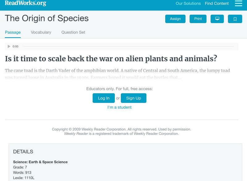 [Free Registration/Login Required] An informational text about problems created when nonnative species become invasive. A question sheet is available to help students build skills in reading comprehension.
