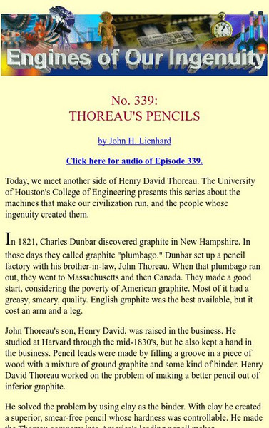 From the Engines of Our Ingenuity website at the University of Houston, this interesting web page provides information about Thoreau's innovations in the world of pencils. The site describes Thoreau's work in the family pencil company....