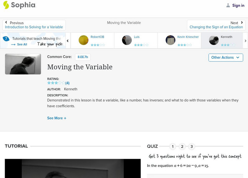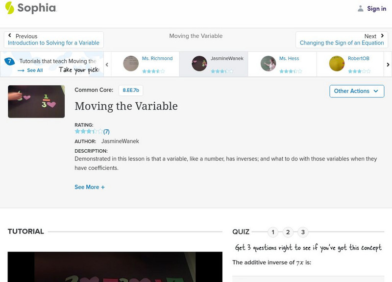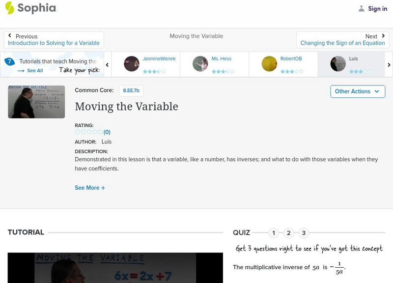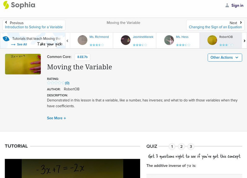 Demonstrated in this lesson is that a variable, like a number, has inverses; and what to do with those variables when they have coefficients. It is 5 of 14 in the series titled "Moving the Variable."