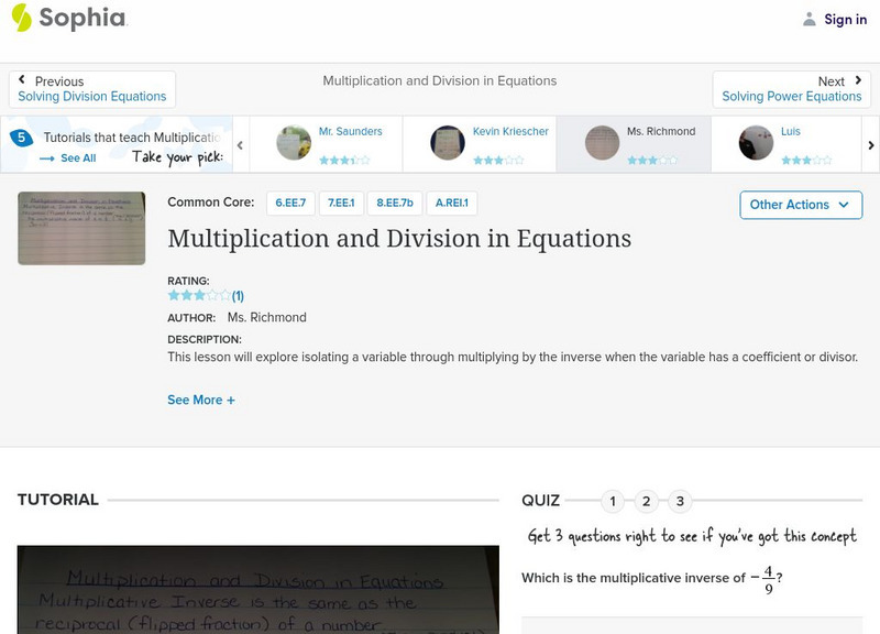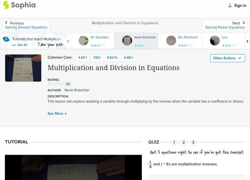 This lesson will explore isolating a variable through multiplying by the inverse when the variable has a coefficient or divisor. It is 2 of 8 in the series titled "Multiplication and Division in Equations."